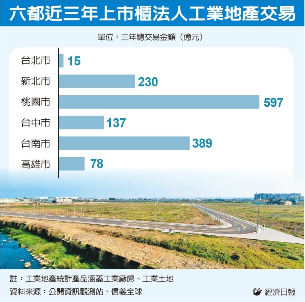 據信義全球資產最新統計,近三年上市櫃法人在六都工業地產投資上,桃園市以累計三年工業地產總交易額達597億元、居六都之冠,台南市則以三年總投資金額389億元緊追在後,新北市以230億元、排名第三,反映上市櫃法人對桃園市、台南市、新北市工業不動產需求相當強勁。