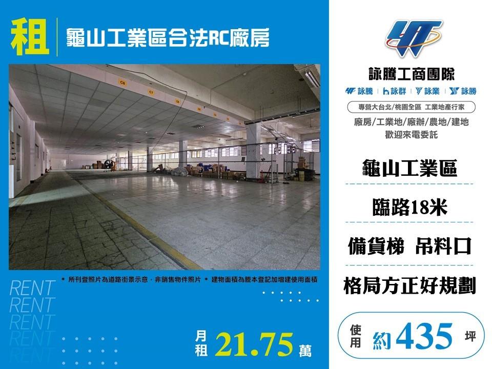 1.臨路18米 2.挑高3.2米 3.電力 三相220/380V 4.龜山工業區產業眾多,鄰近桃園市區、台1線,交通便利好招工 5.獨立貨梯使用,獨立梯間、吊裝口進出,廠內格局方正好規劃 6.適合輕型加工、組裝產線、小型倉庫等