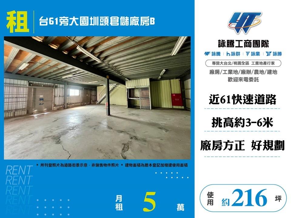 1.臨路 約5米 2.挑高 約3-6.2米 3.近61快速道路 交通便捷 4.門前腹地 方便上下貨 5.有消防,可整棟出租