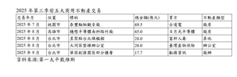 第一太平戴維斯指出,第三季各類型不動產之中,廠房交易最為活絡,金額達 203 億元,區位集中在桃園市的編定工業區,有利於迅速投產;其次為辦公室與廠辦,交易金額分別為 43 億元與 34 億元。辦公室主要集中在台北市核心地區,除台灣產物保險的購置案,達欣工 (2535-TW) 以 6.8 億元購入大安區中古商辦部分樓層,兩者都規劃重建為新商辦大樓。