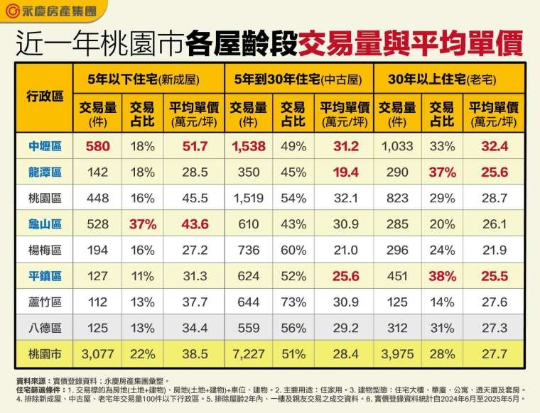 全台六都之一的桃園市成屋交易頻繁,房仲業者盤點桃園市近一年屋齡 5 年以上成屋實價登錄資料發現,「中壢區」成屋不僅平均單價高、交易量更是桃園市第一,而「龜山區」則有近 4 成交易量集中在屋齡 5 年以下的新成屋,反之「龍潭區」、「平鎮區」則是屋齡 30 年以上的老宅交易占比最高,但價格卻與屋齡 5-30 年