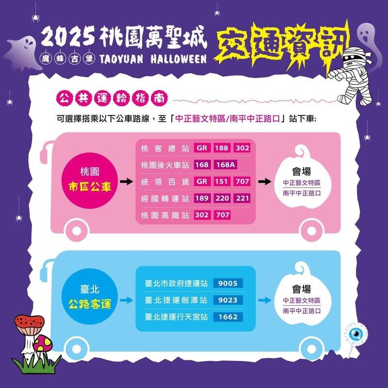 萬聖城假日免費接駁車(24、25、26、11月1、2日)自中午12時至10時30分於「新永和市場停車場」及「桃園火車站(萬壽路出口)」發車直達活動會場,每15至20分鐘一班,搭乘就送限量萬聖小禮物;機車族朋友可在活動期間假日至同安國小正門、同德國小中庭免費停放。