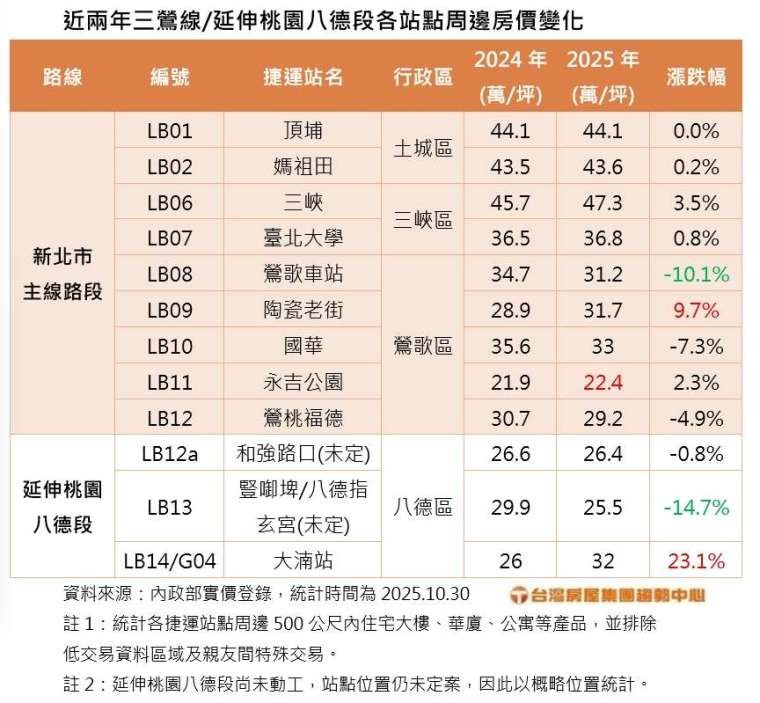 新北捷運三鶯線,預計今 (2025) 年底完工、明年 3 月通車,且串聯桃園的「三鶯線延伸八德段」,預計於明年動工。房仲業者統計近兩年三鶯線各站點周邊住宅價格變化,以桃園大湳站年漲幅 23% 最高,其次是陶瓷老街站年漲 9.7%;而減幅最大的則是桃園 LB13 站,年減幅達 14.7%。