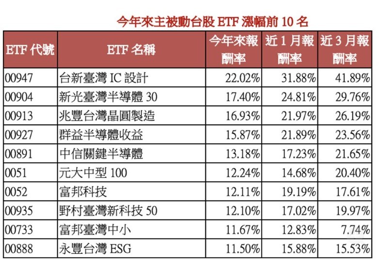 在權王台積電、記憶體族群持續大漲下,台股ETF績效跟著爆衝,今年來才短短不到三周時間,前10強台股ETF皆大賺1成以上,其中,前三強分別為台新臺灣IC設計(00947)漲幅22.02%、新光臺灣半導體30(00904)漲幅17.4%、兆豐台灣晶圓製造(00913)漲幅16.93%。持有較高記憶體比重的00947是今年來是唯一漲幅超過2成的台股ETF,勇奪今年來、一個月、三個月績效三冠王,亮眼成績吸引投資人目光,成交量及規模不斷增加,今年至今規模已增長59%,表現備受市場肯定。