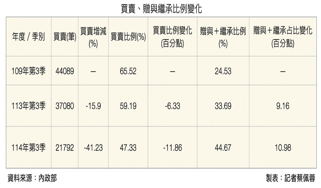 反觀,「贈與與繼承」占比自109年第三季的24.53%,在113年第三季攀升至33.69%,增加9.16個百分點,114年第三季更進一步升至44.67%,再增加10.98個百分點,幾乎與買賣占比持平。