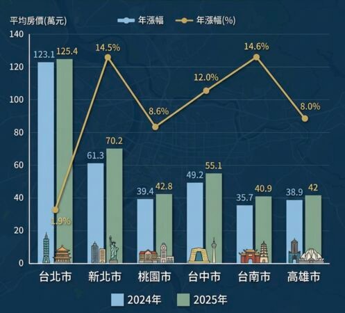 新北市緊追在後,年漲幅14.5%,均價來到每坪70.2萬元。至於房價最高的台北市,年漲幅雖然最低,但也達到了1.9%,每坪均價來到125.4萬元。