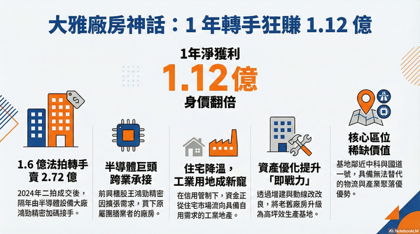 該棟廠房共計5層樓,地坪約453坪,建坪約1014坪,當初出手拍下的,為同樣從事團膳、農產品批發相關行業的巨昌貿易,相關聯性極高。不過就在時隔1年後,2025年12月,該廠房再度轉手,以2.72億元售出,帳面獲利高達1.12億元。