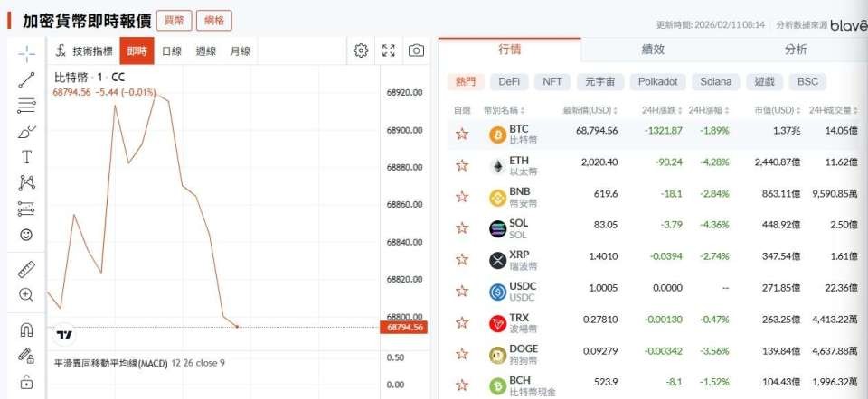週三 (11 日) 截稿前,台北時間 8 時許,根據鉅亨網即時報價,比特幣 (BTC-US) 下跌約 2% 至 68,000 美元左右,24 小時內第二度跌回 7 萬美元下方。