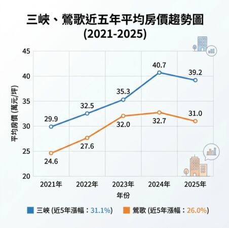 新北捷運三鶯線進入通車倒數階段,沿線房市再度成為市場討論的熱點。中信房屋研展室彙整實價登錄,三峽平均每坪房價來到39.2萬元,近5年整體漲幅仍高達31.1%;而房價相對親民的鶯歌,平均房價也已站上3字頭,五年漲幅26%,漲勢同樣驚人。