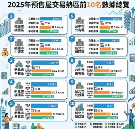 2025年全台各區預售交易量排行出爐,桃園區、中壢區分別以1496戶、1398戶包辦前2名。此外觀察前10名中,新北市共有5區入榜,分別為中和、板橋、三重、新莊、新店,合計高達5476戶。