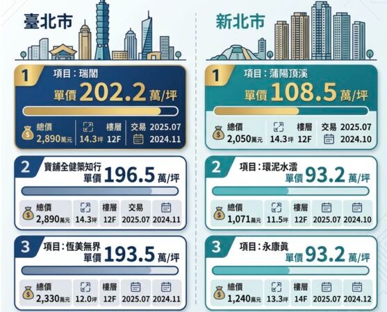 新北市則為永和區的「蒲陽頂溪」、三重區「環泥水澐」、板橋區「永康真」,最高單價是93.2萬元~108.5萬元。