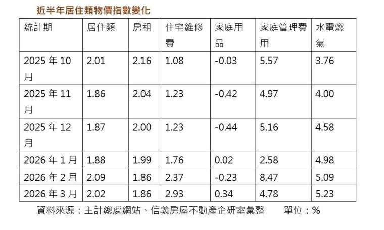 最新統計顯示,房租指數年增率 3 月為 1.86%,較上月持平,但指數仍寫下歷史新高的 110.21,不過長期 2% 年增率的趨勢已被打破,出現連續三個月房租指數年增率跌破 2%,至於變化較大的還有家庭管理費用,3 月年增率仍高達 4.78%,水電燃氣年增率達 5.23%,整體的居住成本物價指數年增率仍超過 2%。