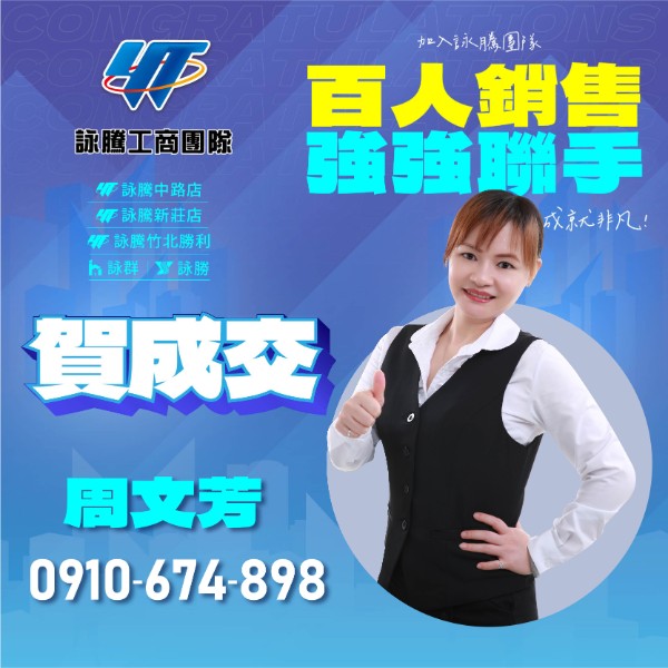 發佈: 2024/09/25 點閱: 348 🏆詠騰工商團隊 新北/桃園/新竹#詠騰 #詠勝 #詠群 #詠騰新北 #詠騰竹北✨✨✨擴大徵才✨✨✨👉房仲+商仲 持續火熱成交中⚡️⚡️賀成交 台31天車廠房⚡️⚡️😍😍😍 恭喜 文芳 于祐😍😍😍🏹想做房仲又想做商仲嗎?✨誰說 #魚與熊掌不可兼得✅但在我們這,你可以同時擁有🥰👍 聯洋房仲團隊【十二店聯營,百人大團隊】👍 詠騰商仲團隊【大桃園/新北,百人大團隊】💥 強強聯手,您房仲商仲首選!我們有房仲及商仲百人團隊系統和資源支持👊🏻這就是大家為什麼想加入我們的原因想做商仲又想做房仲嗎?🌟 加入我們,成就非凡! 🌟#誠徵房仲菁英#誠徵工仲商仲菁英#20年以上仲介實戰經驗帶你飛#新北桃園工業地產首選#工業地廠房買賣租賃超強團隊想更上一層樓、卻舉足不前#是否既期待又怕受傷害不想放棄房仲 卻又想學習商仲現在 #詠騰 是你最好的選擇我們擁有TOP的商仲團隊只要你願意 一起加入我們詠騰歷年獲獎無數2021 #冠軍 全國第二季2021 #亞軍 全國第三季2021 #亞軍 全國年度2021 #冠軍 全國年度2022 #冠軍 桃園區第一季2022 #冠軍 全國第二季2022 #冠軍 桃竹苗年度2022 #亞軍 全國年度2023 #冠軍 全國第一季2023 #亞軍 全國年度2023 #冠軍 桃竹苗年度✨ 2024人才養成培訓計畫 ✨這裡有最全面的培訓和支持,讓你從零開始成為頂尖經紀人華麗轉身、晉升超業,不再只是夢想!🏆 2024等你來創造佳績!☕☕ 聊聊沒損失,合作大有可能 ☕☕⛳詠騰竹北勝利店⛳竹北市莊敬五街118號🏹擴大徵才中☎️0915-062-055 (吳店長)🆔LINE ID:0915062055⛳詠騰中正藝文店⛳桃園區南平路448號🏹擴大徵才中☎️0916-078-268 (楊副總)🆔LINE ID:0916078268✅詠勝官網:https://www.yungsheng.com.tw/⛳詠騰中路店🧑🤝🧑太平洋房屋桃園詠騰工商加盟店⛳桃園區正光二街139號👉詠騰不動產有限公司👉經紀人:(102)彰縣字第00365號🏹營運中、擴大徵才中☎️0989-747-500 (蔡經理)🆔LINE ID:0989747500✅詠騰官網:https://www.yuteng.com.tw/⛳詠騰中正店🧑🤝🧑太平洋房屋桃園詠群工商加盟店⛳桃園區中正路1391號👉詠群工商地產股份有限公司👉經紀人:(107)桃市字第001700號🏹營運中、擴大徵才中☎️0955-138-868(賴店長) 🆔LINE ID:0955138868✅詠群官網:https://www.yungchun.com.tw/⛳詠騰新北店⛳五股區五工三路79號👉詠騰新莊不動產有限公司👉經紀人:(98)桃市經字第001008號🏹營運中、擴大徵才中☎️0900-269-286(劉店長)🆔LINE ID:0900269286✅詠業官網:https://www.yungye.com.tw/